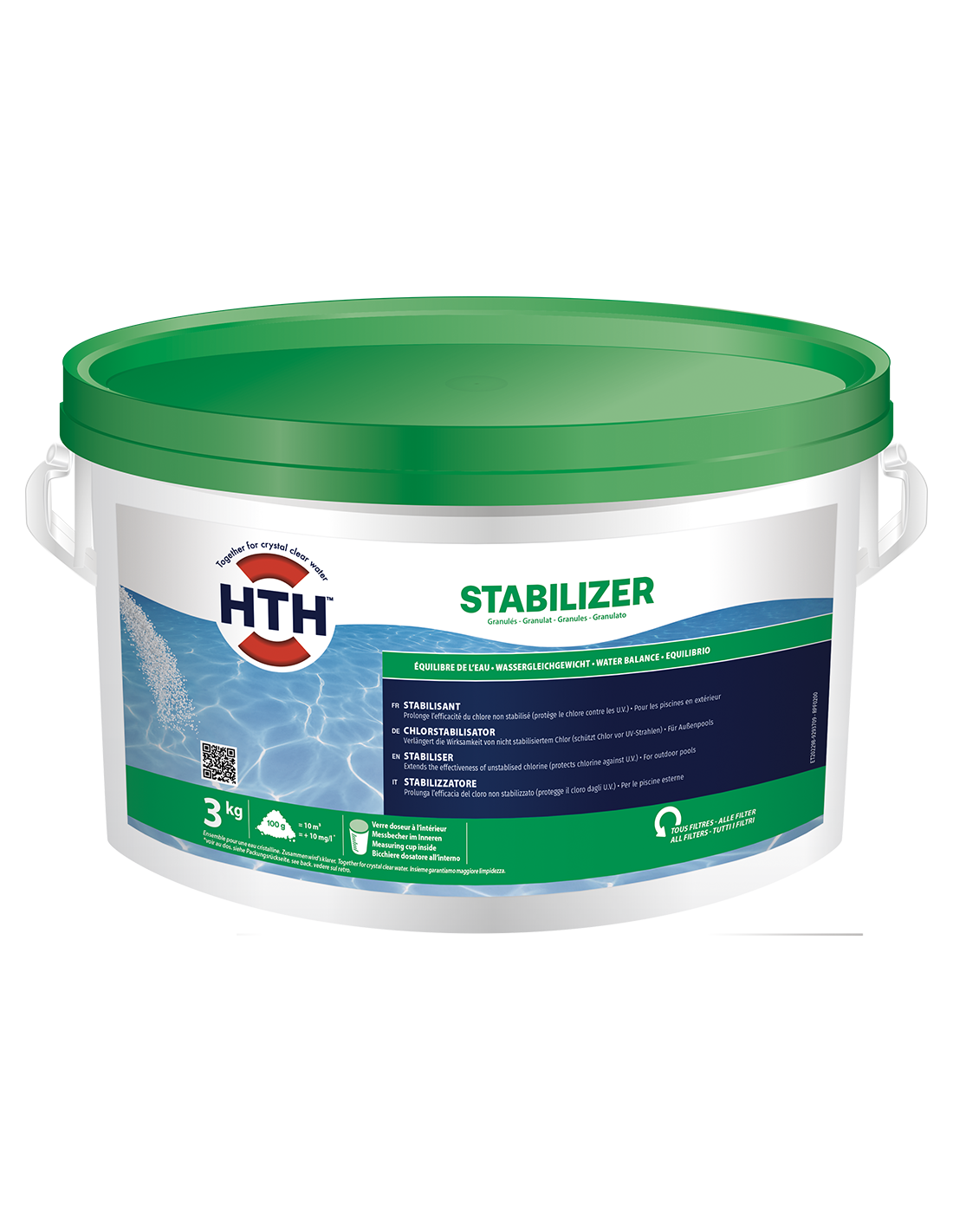 Caractéristiques: Protège le chlore contre les UV. Dissolution lente, sans résidus. Très forte teneur en matière active. Prolonge l'efficacité du chlore non stabilisé. Plus pratique : Un verre doseur.