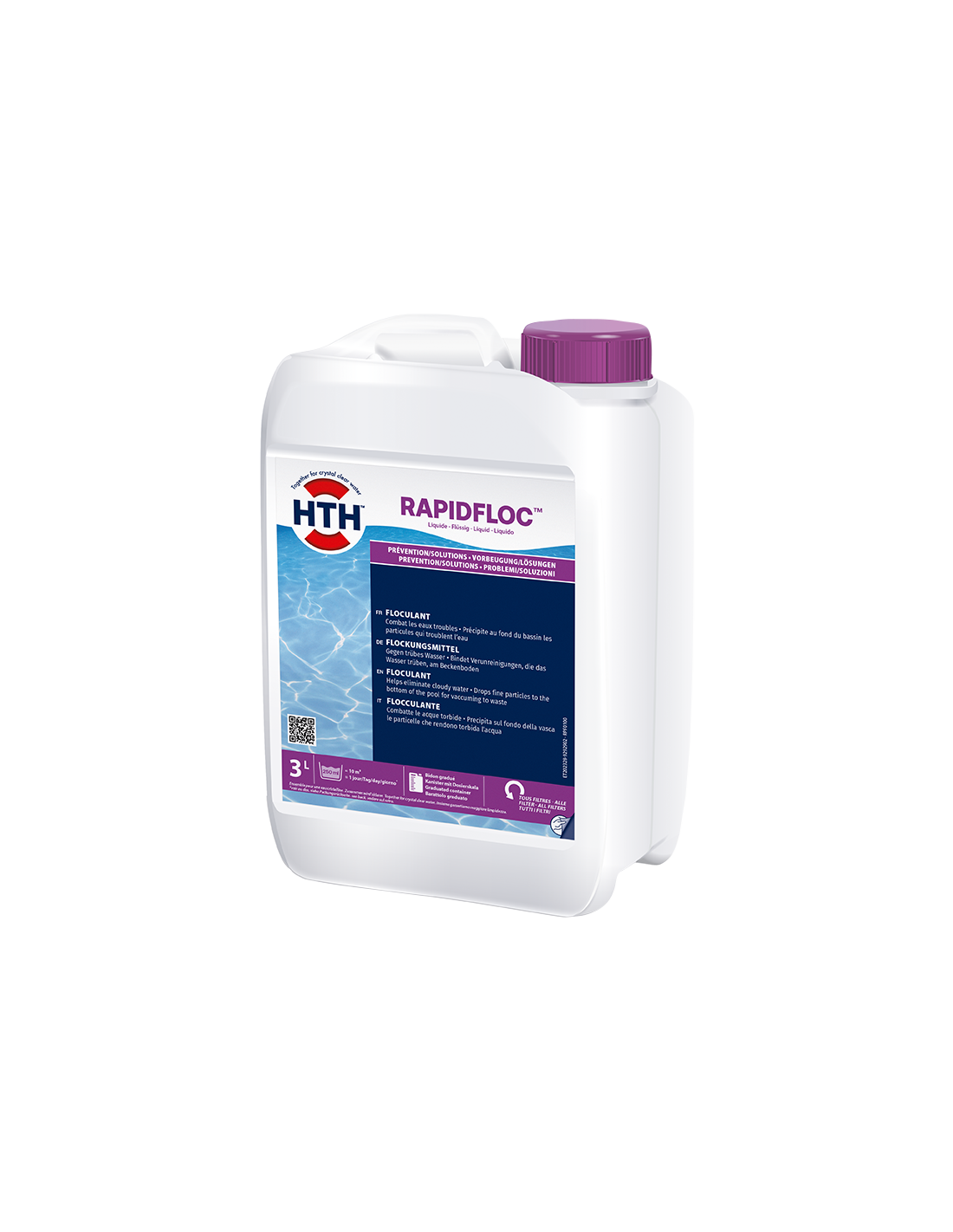 Caractéristiques : Liquide. Pour tous types de filtration >50 m3 hors filtration sur diatomites, à cartouches ou poche filtrante. Combat les eaux troubles. Précipite au fond du bassin les particules qui troublent l'eau. Efficace pour tout pH compris en 6,9 et 7,8. Plus pratique : Bidon gradué