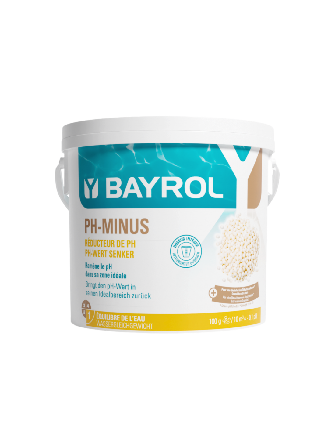 Granulés purs pour baisser les pH des piscines supérieurs à 7,4. Idéal en cas de pH trop haut. Dosage précis grâce au doseur inclus.