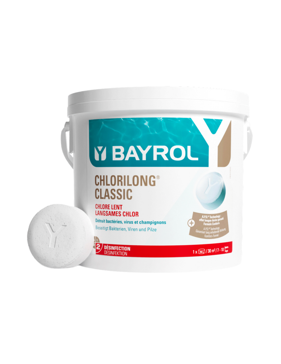Chlorilong® CLASSIC (anciennement Chlorilong® 250) sont des galets de chlore pour piscine de 250 g à dissolution lente et régulière pour une désinfection permanente de la piscine. Ces galets de chlore lent associent la puissance de matières actives rigoureusement sélectionnées et une méthode de compression innovante, la technologie A.P.O.™. Ce procédé permet d’obtenir des galets de très haute qualité. Ils se dissolvent, de façon très homogène et libèrent ainsi une quantité de chlore régulière dans l'eau, pour une meilleure désinfection de la piscine. Sa formule Silk effect, développée par les laboratoires BAYROL, permet de booster l'effet anti-calcaire tout au long de la saison et rend l'eau encore plus agréable après quelques semaines d'utilisation.