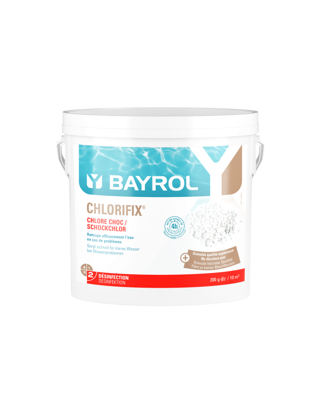 Chlorifix® est idéal pour les chloration choc, en cas de problème. Très solubles dans l'eau, les granulés libèrent rapidement une grande quantité de chlore actif. A son contact, les micro-organismes responsables des eaux troubles et les algues qui donnent sa couleur verte à "l'eau qui tourne" sont oxydés. En quelques heures, l'eau de la piscine redevient translucide et saine. Chlorifix contient de l'acide iso-cyanurique et assure la protection du chlore contre les ultraviolets. Idéal pour les piscines de plein-air et notamment les piscines au sel. Grâce à l'utilisation d'une matière première à haute teneur en chlore de grande qualité, Chlorifix® génère moins de poussière que les granulés standards. Un gage de sécurité à la manipulation.