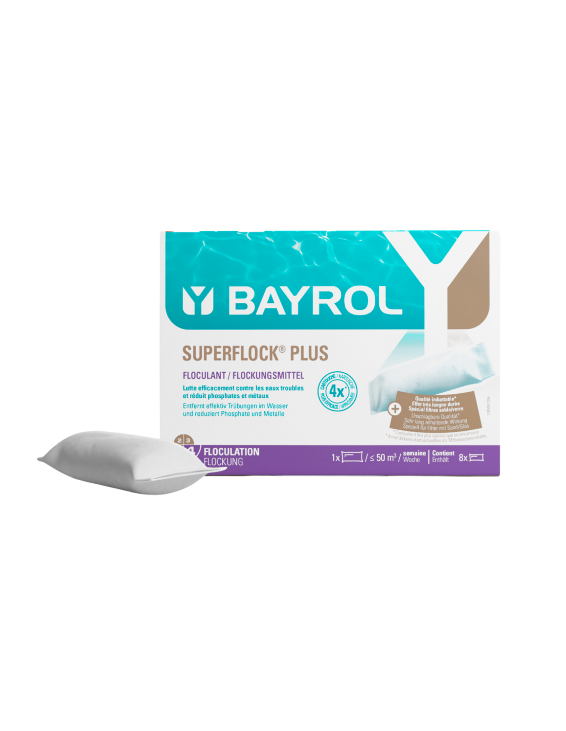 Superflock Plus est un floculant solide pour piscine d'une très grande efficacité présenté sous la forme d'une cartouche composée de galets de floculant contenus dans une enveloppe en feutrine de qualité premium. Cette cartouche de floculant ou chaussette floculant agit de façon continue contre les eaux troubles. Les matières actives, sélectionnées avec soin, se dissolvent très lentement dans l'eau à travers l'enveloppe épaisse et permettent d'obtenir durablement une eau transparente. Par ailleurs, sa formule exclusive élimine les métaux : idéal contre les eaux colorées à cause de la présence de fer ou de cuivre dans l'eau. Enfin, Superflock Plus contient du lanthane, un agent destructeur de phosphate, pour éviter le développement des algues.