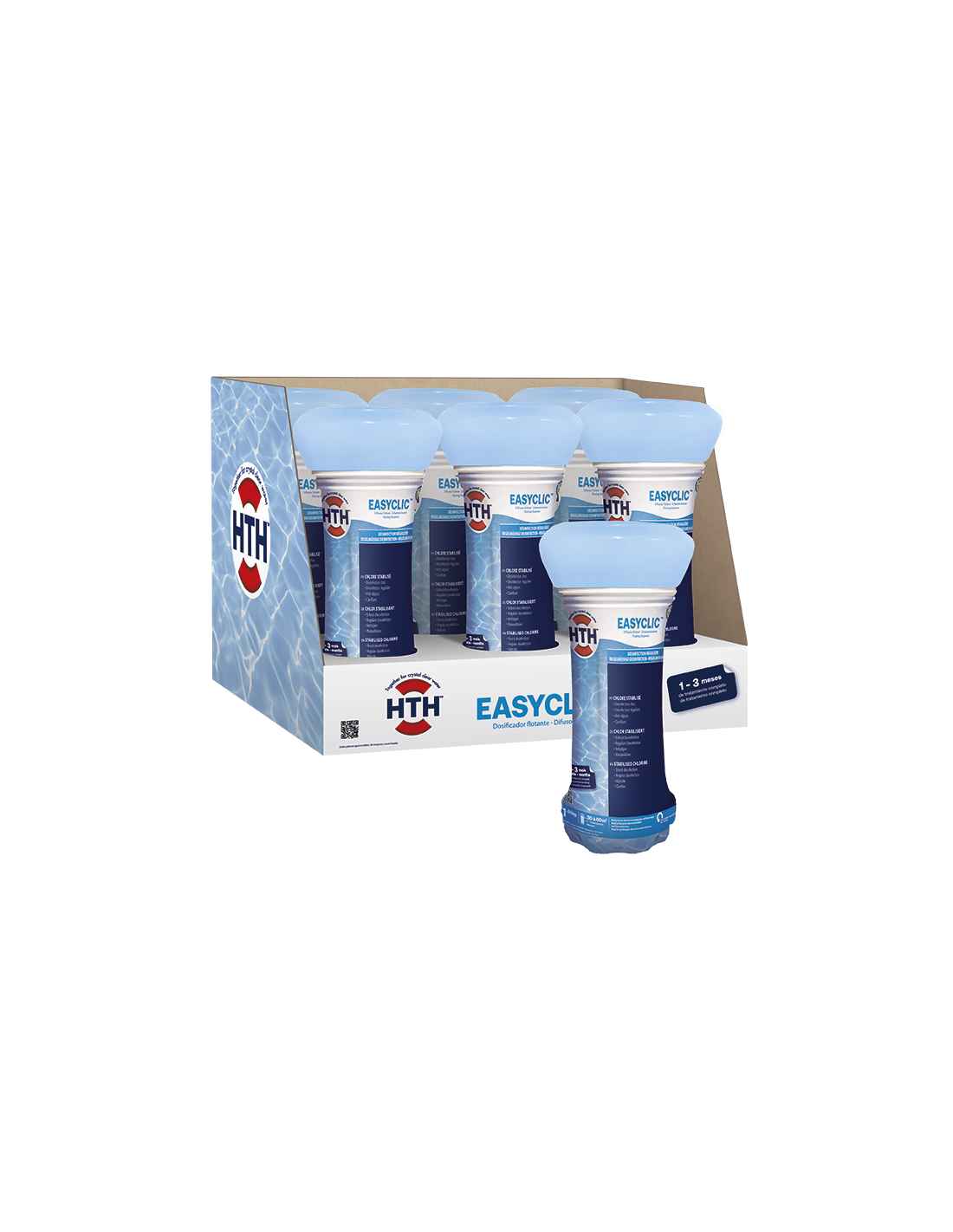 Diffuseur flottant de chlore stabilisé, pour piscines de 30 - 60 m3. Traitement complet multi-actions : 1. Désinfection choc 2. Désinfection régulière 3. Anti-algues 4. Clarifiant. Une fois vide, le diffuseur se couche