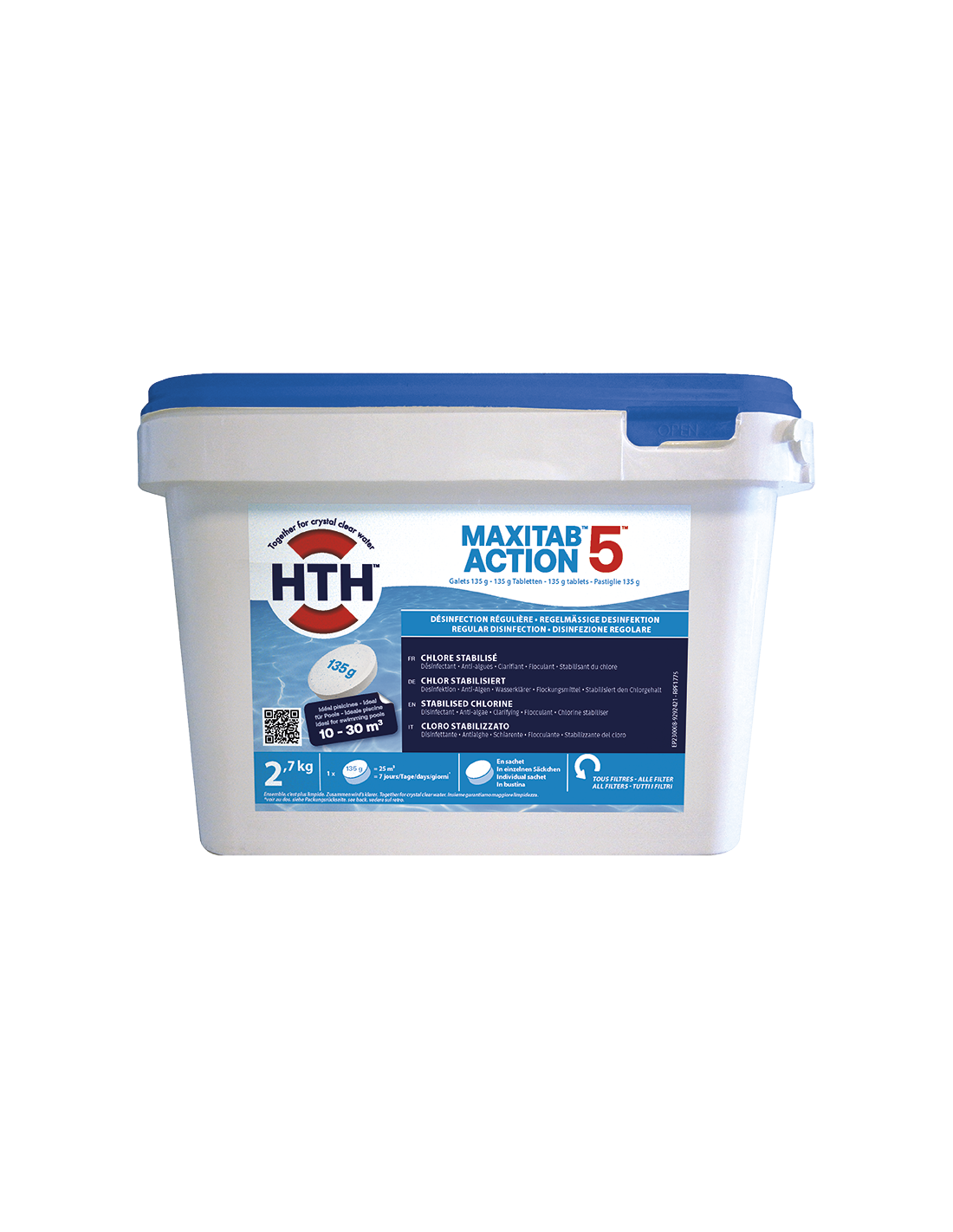 Galets 135g de chlore stabilisé pour piscines hors sol de 10 à 30 m3. Teneur en chlore disponible voisine de 86 %. Traitement complet en un seul geste : Désinfectant, Anti-algues, Clarifiant, Floculant, Stabilisant du chlore. Avantages : Dissolution lente, sans résidus. Stabilisation élevée contre l'action destructrice des rayons ultra-violets de la lumière solaire. Pas de contact : sachet individuel