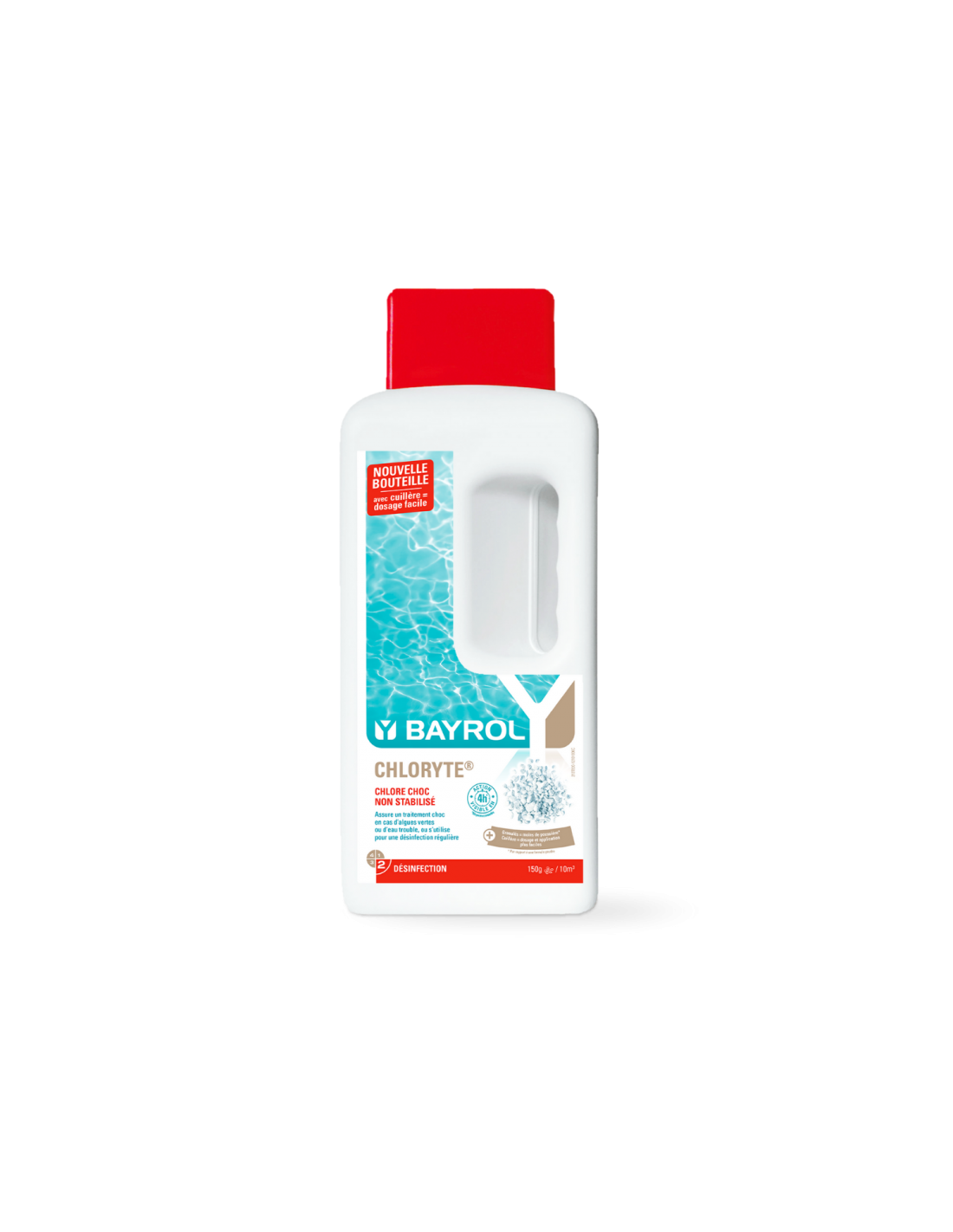 Versez impérativement Chloryte® uniformément sur toute la surface du bassin et en l’absence de baigneurs. En cas de température d’eau inférieure à 20 °C ou de profondeur de bassin inférieure à 1m, vous pouvez dissoudre Chloryte® dans un seau propre d’eau tiède (max 400 g / 10 L d’eau). Important : lors de la préparation d‘une solution, ajoutez toujours en premier l‘eau dans le récipient, puis Chloryte®. Versez ensuite la solution directement dans le bassin, devant les buses de refoulement.